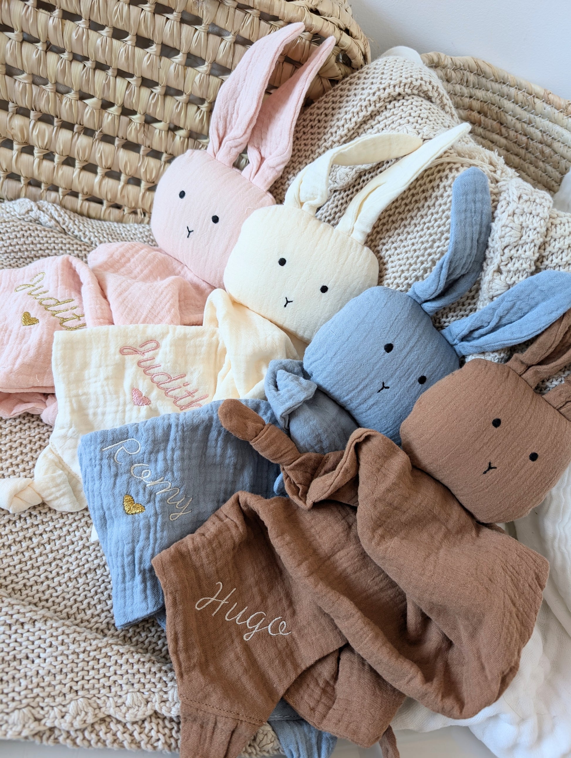 Simple, épuré, élégant, avec une broderie accompagnée d'un petit coeur subtilement placé dans le bas du doudou ... On adore 😁🥰